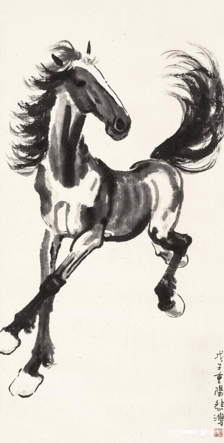 《奔马》作于1948年,此时他的这种大写意画马法已臻至成熟,可信笔挥毫,笔墨苍浑。图中一匹奔马从远处疾驰而来,精神抖擞,意气风发。
