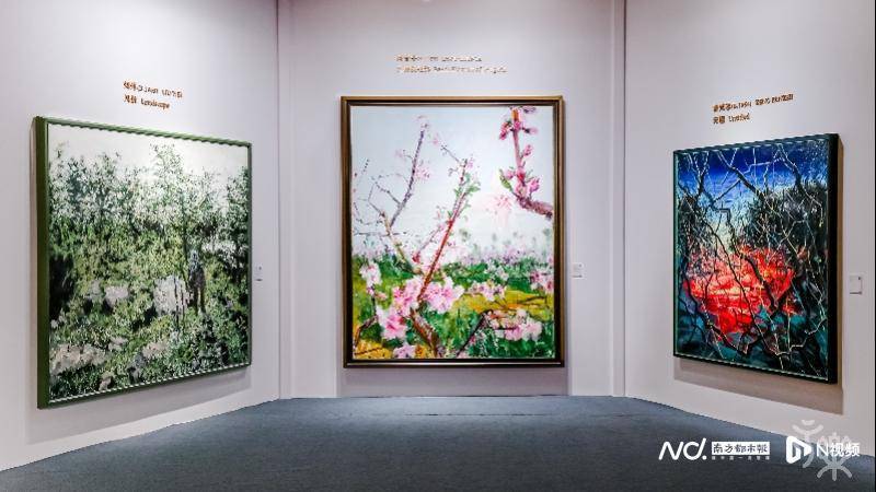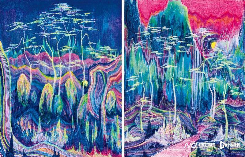 黄宇兴的绘画以华丽璀璨的视觉语言和迷幻暧昧的神秘主义而备受赞誉。《春江花月(一组两件)》灵感来自于北宋山水画传统,画家将前者宏伟的构图以及“峰峦深厚,势伏雄强”的气势与荧光色相结合,为山水这一古老的画题赋予了全新的格调与视觉范式,进而完成了对于中国伟大绘画传统的致敬与当代转换。