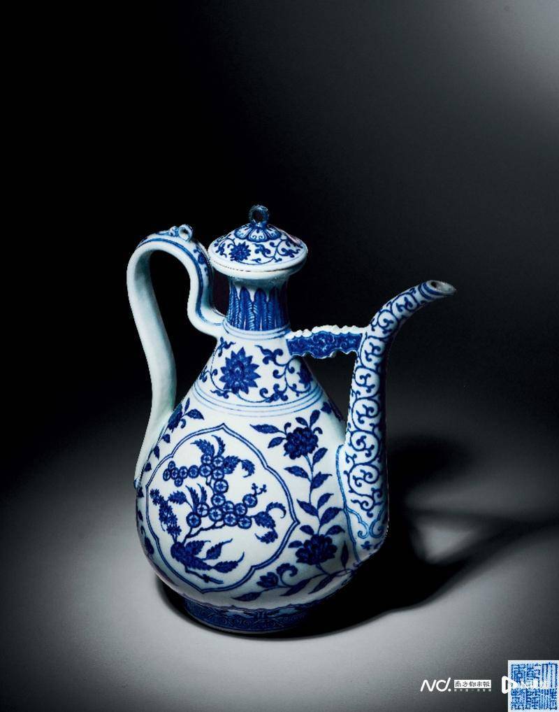 乾隆皇帝对永宣青花苍劲深沉极为尊崇,曾多次命景德镇御窑仿烧,此式执壶即仿永乐时期青花执壶而制,永乐时期例参考北京故宫所藏,器型略加化裁,较之永乐时期更为秀美规矩,壶身上秀下实,稳重典雅。本品属于清宫御瓷之经典品类,嘉庆、道光时期见清档名称或为“仿宣窑青花仙桃有盖执壶”,因彼时清宫对永乐宣德青花无法区分,概以宣窑呼之。此品类盛行于嘉道二朝,止烧于道光二十五年,因其造型复杂,烧造及留存时期极易损坏,故而难有整器传世,本品壶盖尚存,更为难得。