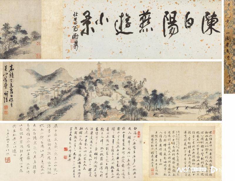 明代 陈淳(1483-1544) 虎丘图卷 清嘉靖十四年(乙未1535)作 手卷 设色纸本 引首:29.5×79cm,约2.1平尺;画:29.5×129cm,约3.4平尺;跋1:26×33.5cm,约0.8平尺;跋2:29.5×76.5cm,约2.0平尺