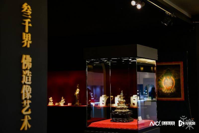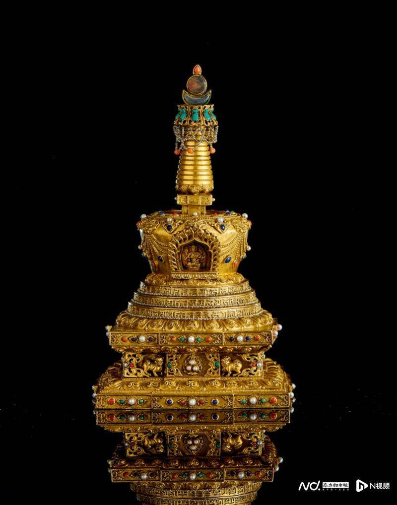 清康熙 (宫廷)铜鎏金嵌百宝尊胜佛塔为尊胜式佛塔,是为纪念释迦牟尼战胜病魔,证达自主生死之境而建,亦可代表世尊入灭之后之法身,以供奉养。它既是信徒朝礼圣地的指引,也体现着对圣者的追思与崇拜。佛塔以精铜铸造,通体鎏金嵌宝为饰,呈覆钵式,下承方形基座,象征须弥山,样式为典型的须弥座式,分台基、上枋、下枋三部分,中部束腰,其上为三层圆形的塔阶,显示其为尊胜佛塔,瓶状塔身象征功德圆满,塔身正中开莲瓣形「眼光门」,其内供奉结跏趺坐于莲台之上的尊胜佛母。十三层塔颈象征佛教所谓的十三重天,又可表示修成正果的十三个阶段; 塔剎又分为火焰、日、月及承露盘,象征苍穹。