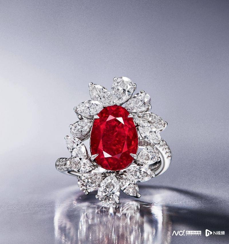 稀有的5.11克拉天然缅甸抹谷「鸽血红」红宝石配钻石戒指,未经加热 18K白金镶嵌5.11克拉椭圆形红宝石,配镶钻石总重3.114克拉 指环尺寸14 附GRS证书,2019年,编号2019-078987,鉴定为5.11克拉天然红宝石,椭圆形,鸽血红色,未经加热,产地缅甸抹谷