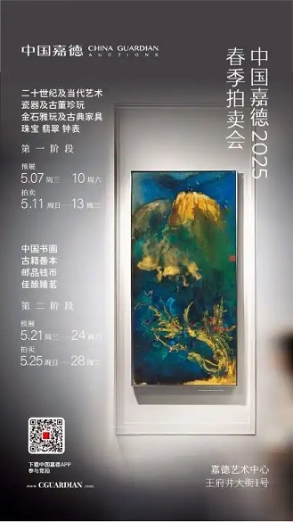 中国嘉德2025春季拍卖会在嘉德艺术中心开幕。此次春拍分两个阶段。第一阶段为二十世纪及当代艺术、瓷器及古董珍玩、金石雅玩及古典家具、珠宝翡翠钟表,5月7日至10日预展,11日至13日拍卖。第二阶段为中国书画、古籍善本、佳酿臻茗、邮品钱币,5月21日至24日预展, 25日至28日拍卖。