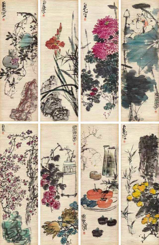 陈子庄《花卉八条屏》(竹帘画)