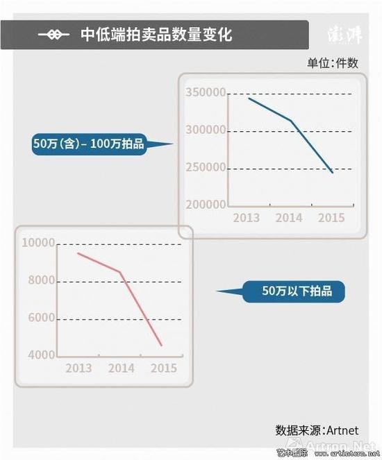 针对中低端拍卖市场的企业,日子自然也不好过。2015年,中国大陆共有274家企业举办中国文物艺术品拍卖,较上年减少了18家,这是近五年来中国大陆拍卖企业数量首次出现下降,减少或暂停拍卖的均为中小型拍卖企业。这种情况在拥有今年北京春拍中表现格外明显,据中国经济网报道,与去年同期相比,因为取消或延迟春拍的拍卖公司超过五成。