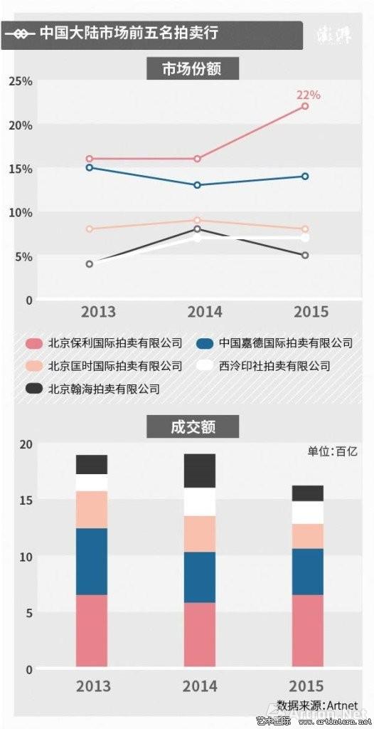 成交额排名前五的拍卖企业的市场份额在过去三年中持续增长,从2013年的47%提高到2015年的56%,五家企业扎实地占据了市场半壁江山。