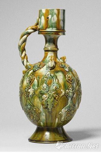 唐 三彩贴花双系绳柄壶 成交价:87.4万美元 苏富比坂本五郎专场