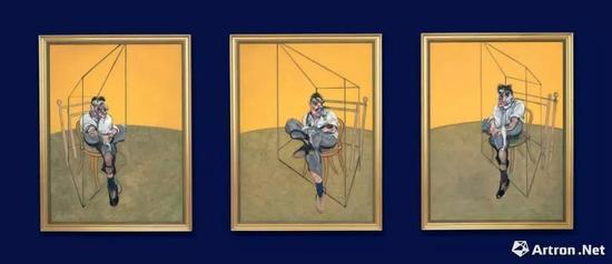 英国艺术家法兰西斯·培根(Francis Bacon)在其1969年的作品《卢西安·弗洛伊德三习作》(Three Studies of Lucian Freud)中,生动地描绘了他的朋友、同是画家的卢西安·弗洛伊德(Lucian Freud)。以象征着阳光的鲜黄色为背景色的这幅三联画作尺幅宏大、震撼人心,艺术家的每一笔彷佛都散发出勃勃生机。三幅画以三个不同角度描绘弗洛伊德坐在椅上的样子,标志两人之间的紧密联系。