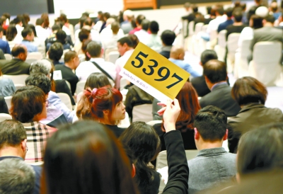 一买家在香港苏富比2018年春季拍卖会现场举牌竞拍。 |