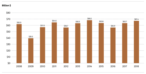 图1 2008年-2018年,全球艺术品市场拍卖成交额走势