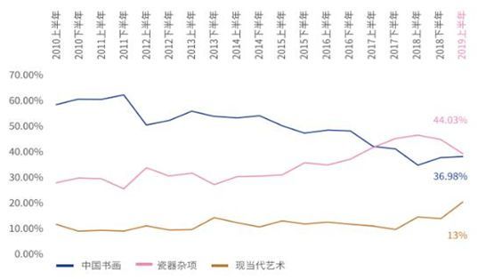 图4 2010 年—2019 年, 三大艺术品类成交额占比图