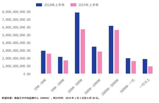 图5 2018 上半年 -2019 上半年,10 万以上拍品不同价格区间成交额分布图
