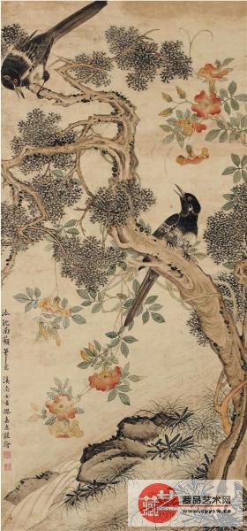 清 缪嘉惠 双喜松寿图 98×46cm 设色纸本 镜片