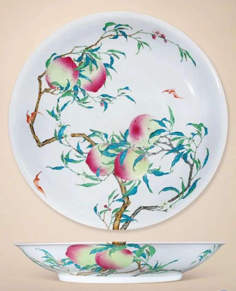 清雍正粉彩过枝福寿双全八桃五蝠大盘以3852.5万元成交,该作以精湛的笔法工笔写出一颗桃树,其枝干虬错矫健,蜿蜒而生,时而乍然转折,却总与碗形相得益彰。花蕊及花苞以细笔淡墨勾勒,突显其高洁清雅,密而不乱,充分表现画家功力。