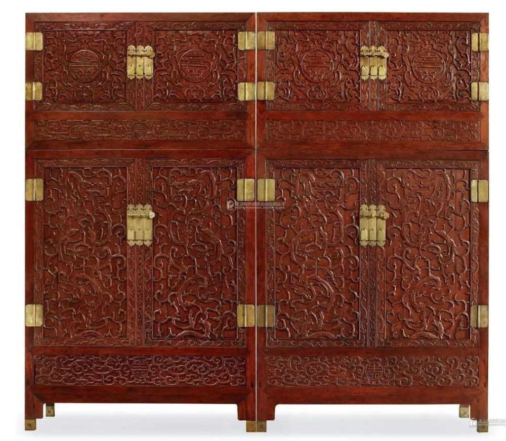 黄花梨雕螭龙螭凤捧寿纹双闷仓大四件柜(成对)