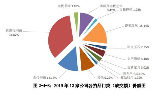 三是传统板块基本稳定,新晋门类表现良好。2019年度,12家公司在中国书画、瓷玉珍玩、邮品钱币、信札手稿等门类上基本保持平稳,在紫砂茗具、文房清供、古典家具、宫廷艺术等门类上成交额有不同程度提升,但在古籍碑帖、珠宝玉石、油画及当代艺术、佛教艺术等门类上成交额有明显下降。