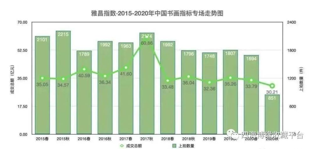 从近年来书画版块的走势图来看,2020中国书画版块的成交额虽然并无大幅度的变化,但在上拍量锐减的情况下,仍然取得了不错的成绩。