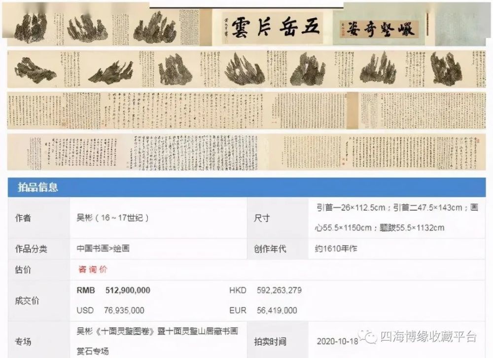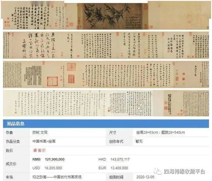 中国传统书画出现了超高价,如:吴彬的《十面灵璧图卷》,以5.129亿元高价成交;任仁发的《五王醉归图》以2.7亿余元成交。苏轼、文同的《墨竹卷》以1.219亿元成交。