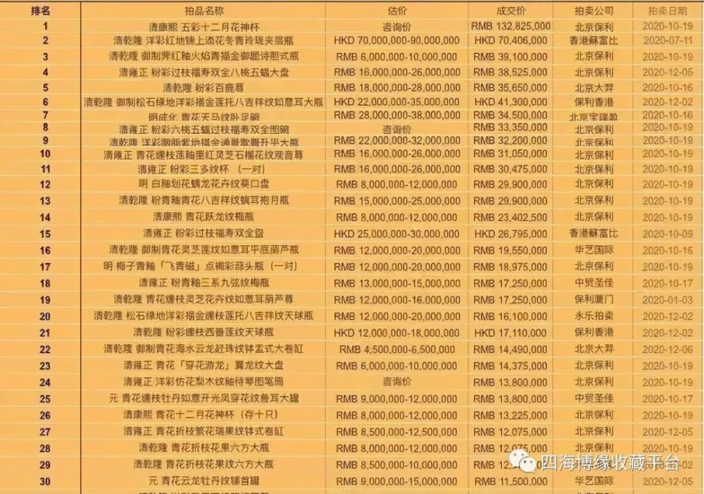 图|2020年中国瓷器拍卖过千万榜单,图源雅昌艺术网