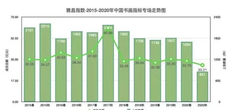 自2015年起,中国进入到一个全新的时期。这一阶段各家拍行大幅缩量起到了很好的效果,与此同时增质,在2017年度持续攀登,达到了市场平台期的一个高峰。此后一直到2020年,由于疫情影响,中国书画板块的成交额虽然并无大幅度的变化,但在上拍量锐减的情况下,能够取得如此的成绩实属不易。