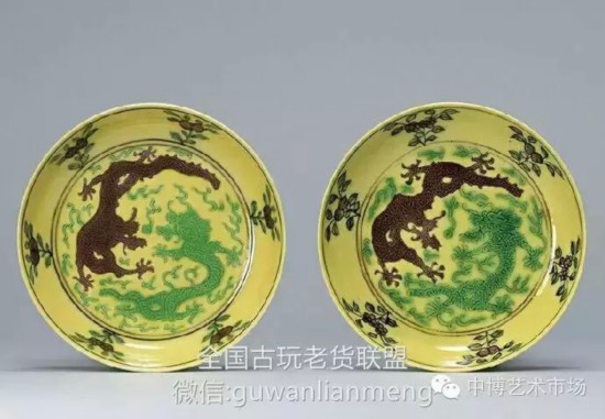 道光蓝地黄彩龙纹盘一对(20-30W)