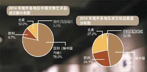据统计,共有325家海外拍卖企业推出中国文物艺术拍品或拍卖会,总成交额共计23.1亿美元(147.8亿元人民币),比上年下滑1.1%。尽管绝大 部分中国文物艺术品仍然在中国境内交易, 海外地区在市场份额上却有小幅增长,又因为市场流通量有限,海外地区中国文物艺术品成交率高达60.9%,远高 于中国内地的46.7%。