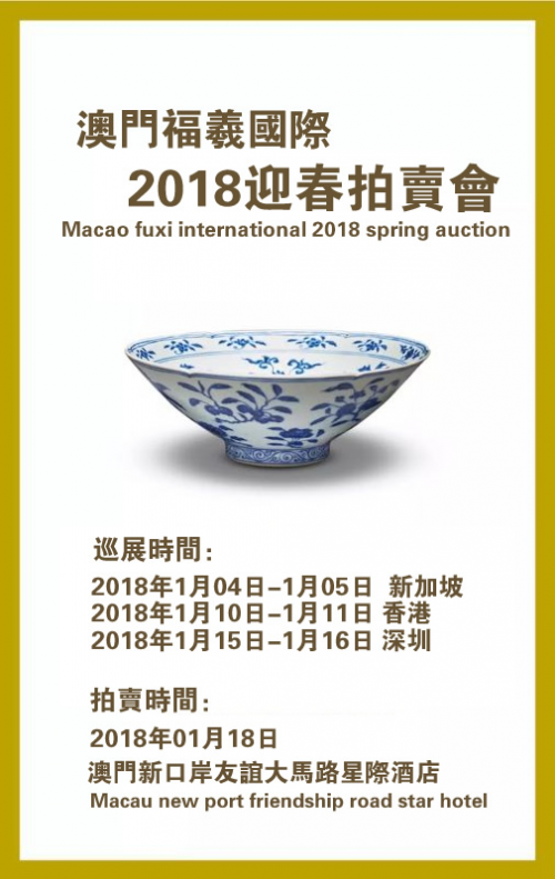 承接福羲国际拍卖集团公司亚洲区中国官窑瓷器部于2017年拍卖会创下的佳绩,我们现正为2018年度澳门福羲国际迎春拍卖会徵集拍品。10月,中国香港官窑瓷器部国际总监李文强将专程前往法国;12月前往新加坡与广东深圳,与藏家会面,并提供免费及保密的估价服务。