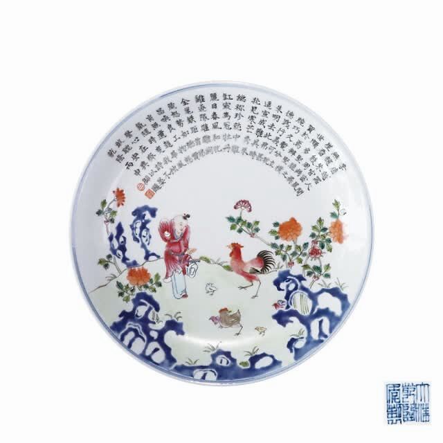Lot10:清代 粉彩婴戏锦鸡诗文赏盘