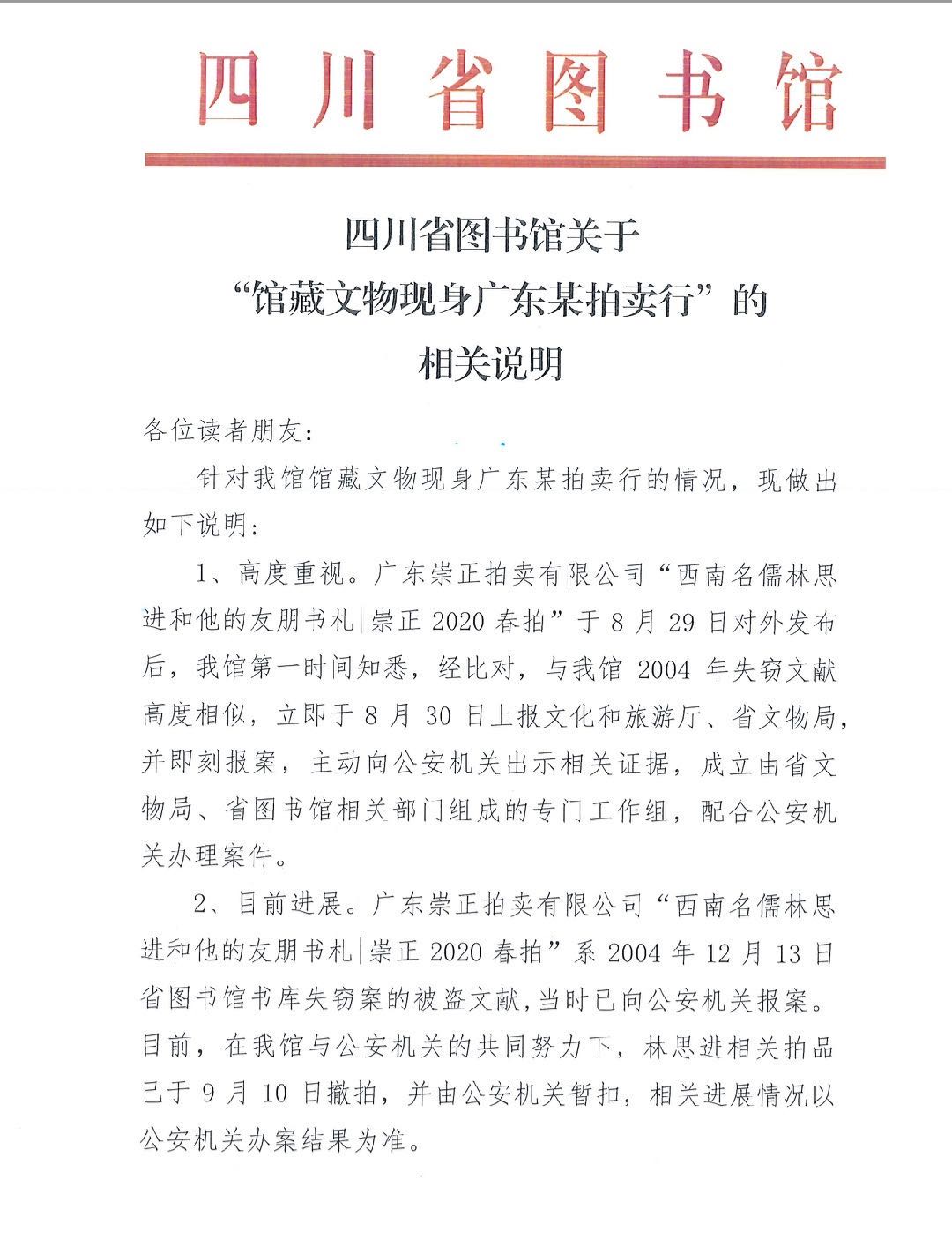 (原题为:《独家 | 广东崇正拍卖公司首次正面回应“川图”失窃文献流出一事》)