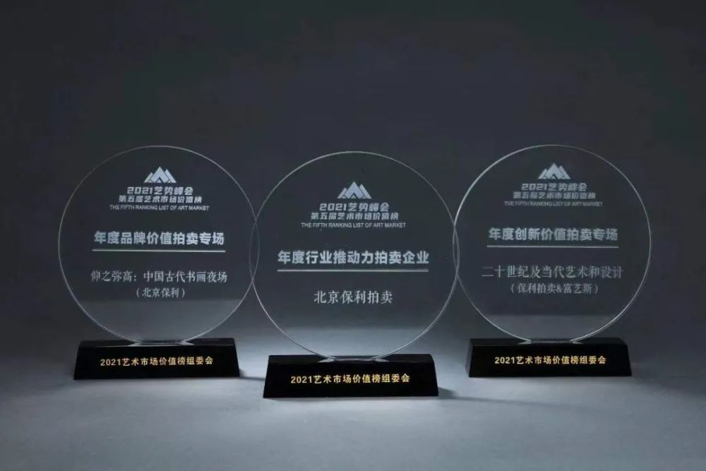 由北京商报社、北京拍卖行业协会联合主办的“2021艺势峰会——第五届艺术市场价值榜颁奖盛典”中,北京保利拍卖荣获“年度行业推动力拍卖企业”奖项,“仰之弥高——中国古代书画夜场”荣获“年度品牌价值拍卖专场”奖项,保利拍卖联合富艺斯“二十世纪及当代艺术和设计”荣获“年度创新价值拍卖专场”奖项。