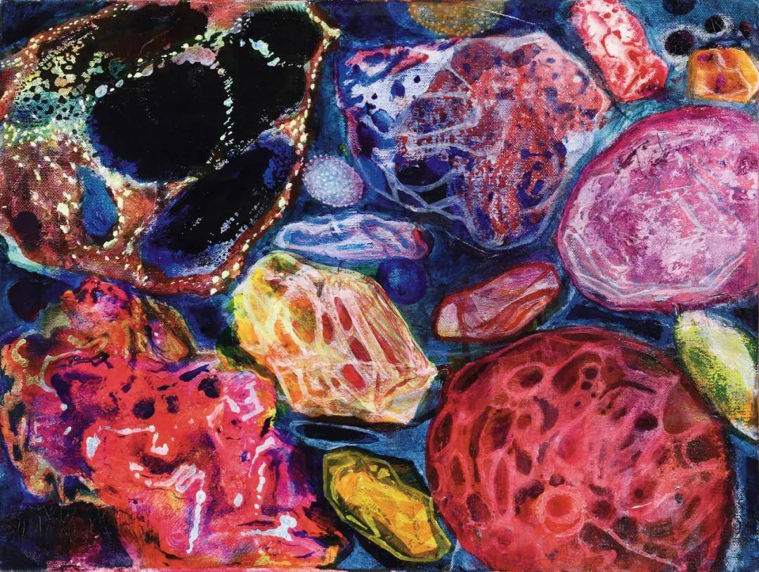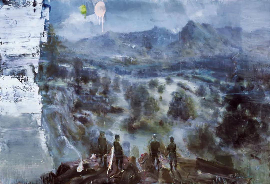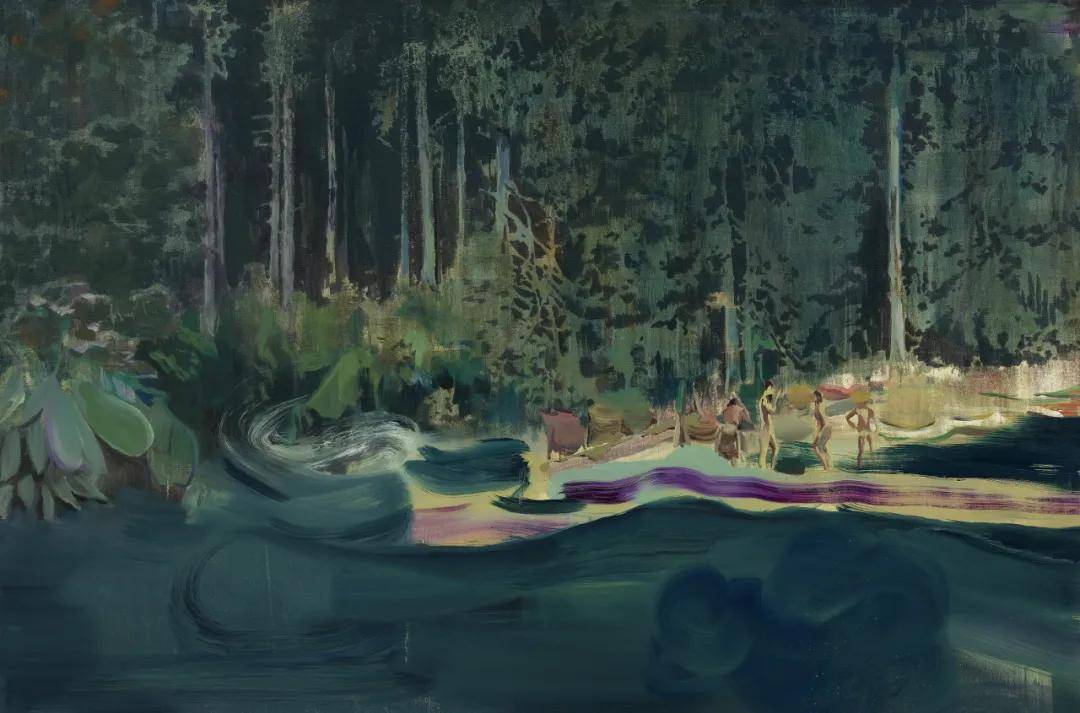 从《海景》中,图像性被控制在最低限度,而绘画性则被激发到最大,即体现为形体塑造与笔触表现的双重变奏。图中的四个人物从笔触中呼之欲出,又适时消隐在稠厚的颜料之中,与周围的景色融为一体。在狂暴又幽深的画面下,韦嘉通过调节感性与物性来平衡着认知与本能,彻底告别了早期偏卡通主义的创作阶段,进入了涂抹式的、更加绘画性的阶段,在绘画语汇的掌握上更偏向于一种痕迹、笔触或者一种书写。