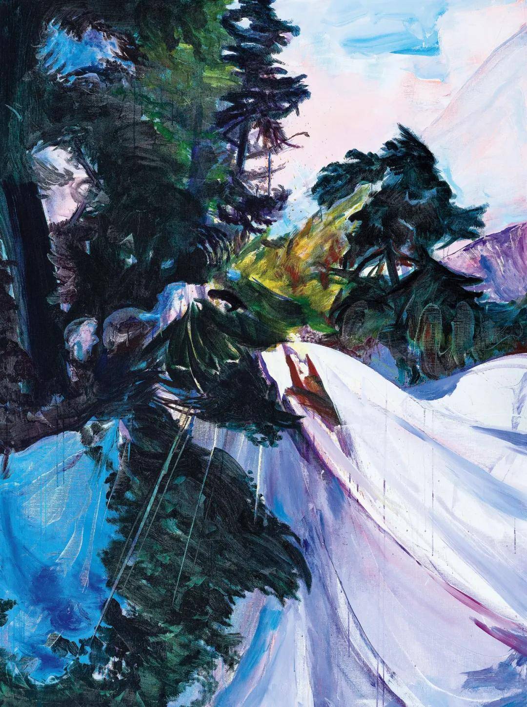 在近十余年对于青春和自我的反复描摹后,韦嘉近期的绘画剥离了画面中的晦暗,回到了更加纯净的色调。创作于2015年的《海景》是韦嘉这一艺术转型时期的最重要的代表作,其灵感来自于十九世纪英国作曲家埃尔加(Edward Elgar)的同名大提琴协奏曲。韦嘉将音符转化为画面,由粗犷的笔触和丰厚的颜料挥洒出海浪与礁石、天空与远山的空间,再创作出一片充满混沌与辽阔的精神风景。