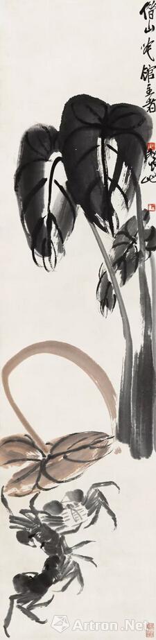 齐白石 《芋叶螃蟹》 设色纸本,136×33cm 估价:RMB300,000-400,000