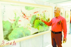 现年76岁的郑文岩虽已满头白发,但站在自己所画的以金鱼和荷叶为主题的国画“锦绣年华”前向来宾介绍画作特点时依旧精神矍铄。郑文岩出生在佛山南海,从小就致力于国画的研习和探索,尤其擅长画山水、花鸟和虫鱼。其作品融传统技法和现代审美技巧于一体,曾多次在海内外举办画展并获奖。2014年,郑文岩受邀担任广州日报书画院理事。