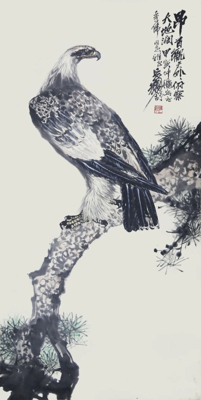 岳翔舒 立轴纸本设色 款识:昂首观天外俯察大地阔 钤印:翔舒 尺寸:67×137cm