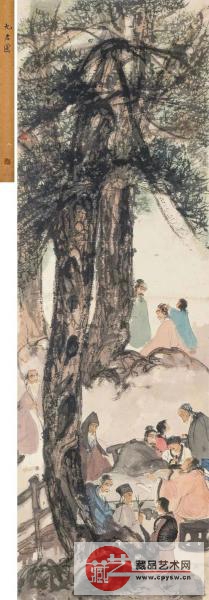 此次上拍的《九老图》描绘了九位老者于茂林间吟诗属文的场景。参天古树下,九位老者或立或坐,有围坐于桌前品诗谈画者,有驻足古树旁凝神远眺者,有相对侃侃交流者,姿态各异。另有四位侍童点缀穿插其间。画作充分体现了傅氏人物画中常见的鹤眼修长、双眉入鬓之态。此作由傅抱石创作完成后一直由其家属收藏于自家书斋,傅抱石离世后,一度存于南京博物院,1979年连同《大涤草堂》《二湘图》《柳荫仕女》等十件精品得以返回傅家,经过数十次权威著录,此前从未露面于市场。