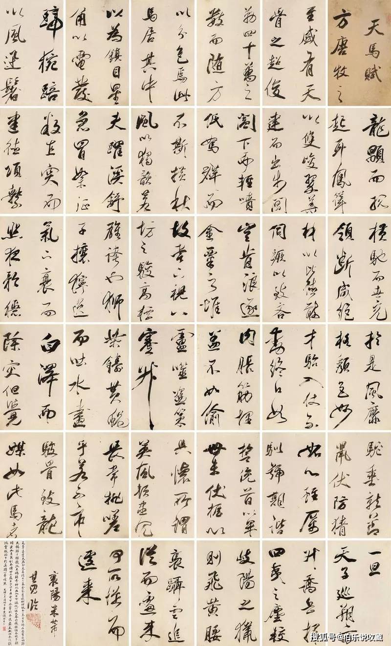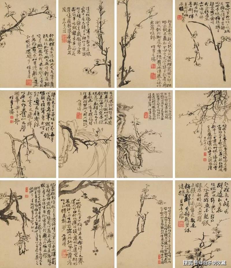 是册为十二开册页,每开皆独立成章。各绘梅花于方寸之上,构图不拘泥古法程式,或斜插画面,或盘曲如龙,营造出破空而出的视觉张力。线条如“金刚杵”般刚劲有力,却又在转折处保留着自然的柔韧,使得石涛笔下的梅花充满了"倔强与孤傲"的生命力。每开册页均有石涛自题诗文一首,细观其笔迹,行笔时快时慢,墨色忽浓忽淡,字形或正或欹,仿佛信手拈来,却又处处暗合古法。书风率性真率,笔意恣肆纵横,展现出“我自用我法”的强烈个性。