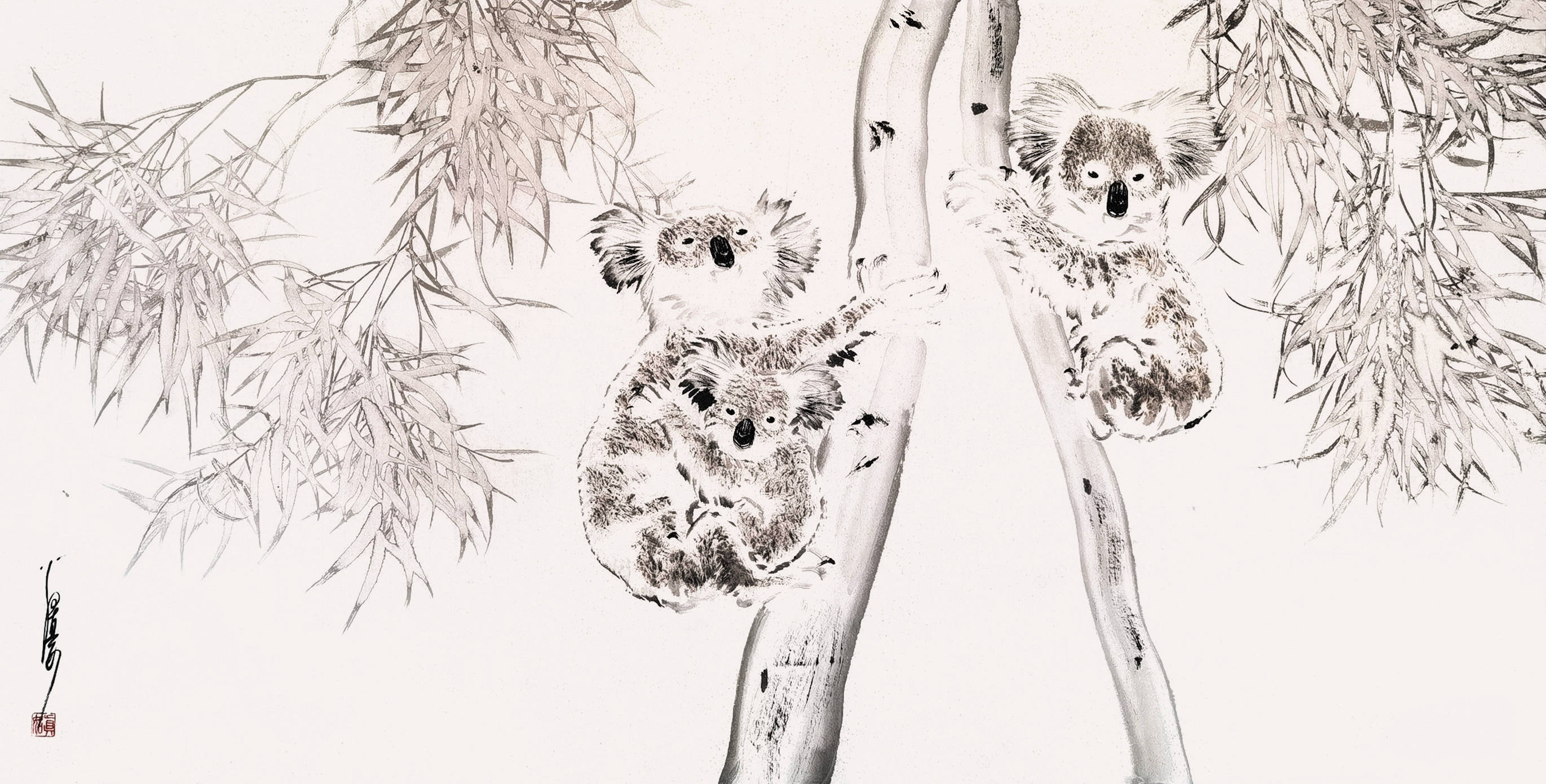 这幅水墨作品以传统国画笔墨绘澳洲标志性动物考拉,三只萌态可掬的考拉攀附于枝叶间,既保留了岭南画派“注重写生、兼工带写”的笔墨精髓,又融入艺术家旅居澳洲数十载的生活观察——蓬松的皮毛以淡墨晕染出层次,灵动的神态则借简练线条点睛,东方写意与异域生灵的碰撞,让作品兼具文化融合性与艺术感染力。