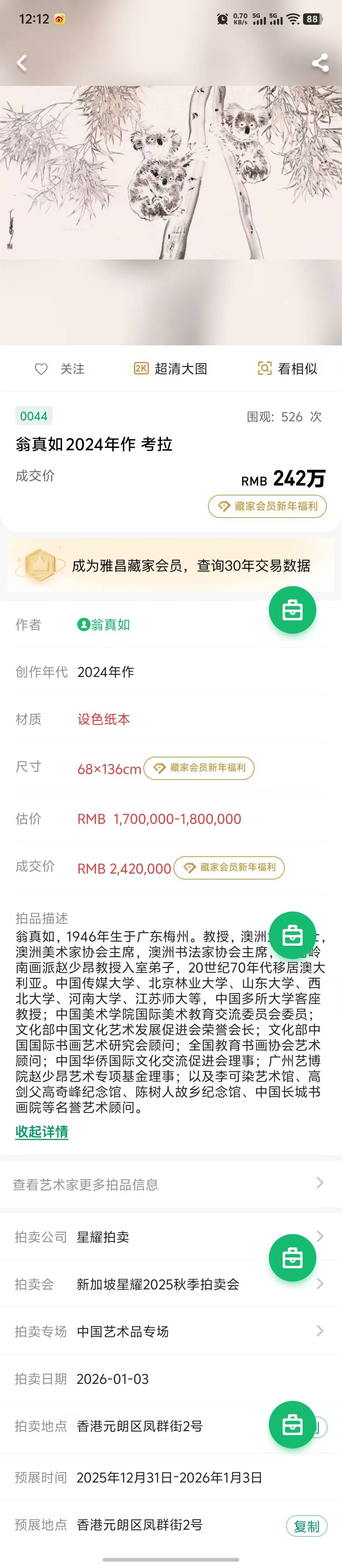 2026年1月3日,新加坡星耀2025秋季拍卖会“中国艺术品专场”现场,岭南画派传人翁真如2024年新作《考拉》以超出高估价近70万元的242万元人民币成交,成为本场焦点拍品。