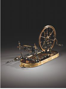 玳瑁螺钿工艺作品亦有以日常用品为模型,例如此件纺车,亦属朱利安·高斯密爵士(SirJulianGoldsmid)收藏。本品糅合铸模及浇金工艺,镶嵌珠母贝,工序复杂巧究,成品精致独特(估价:4万至6万欧元)。