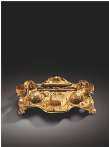 齐纪巴什收藏另一件精品:十八世纪上半叶英国制墨水台(估价:20万至40万欧元),设计及造工华丽夺目,质素精良,甚为罕见;灵感源自法国名匠梅松尼耶(Juste-AurèleMeissonnier)的作品,但明显可见英伦特色,足证是英国制品。