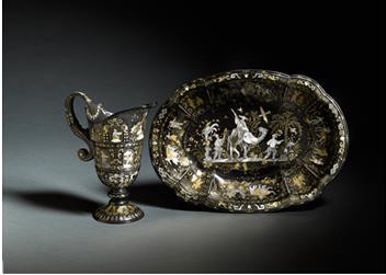 一对银胎局部鎏金阿波罗及伏尔甘雕像,阿伯拉罕·德仁维特二世作,年份约1700至1705(估价:6万至8万欧元),是十七末至十八世纪初期间的顶尖金匠代表作;另一件金器工艺杰作是奥格斯堡金匠大师马克思·维诺(MarxWeinold)的银胎局部鎏金盘及水壶(估价:10万至20万欧元),年份约1697-1699。十八世纪佛罗伦萨大公爵工坊传世名作甚多,足见当时工艺水平之精湛纯熟,本拍卖呈献其中一对彩色硬石细工镶嵌饰板(估价:7万至10万欧元)。