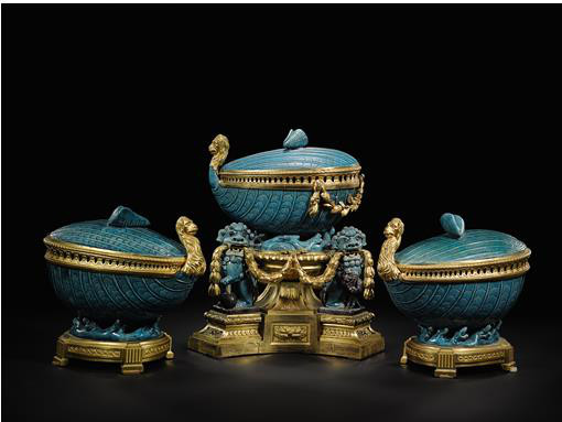 此孔雀蓝釉嵌鎏金铜干花果香盘摆设一套三件,出自清康熙年间(1662-1722年),饰路易十五鎏金铜镶嵌件(约1765-1770年)(估价:100万至200万欧元),纹饰精致,用料巧究,极为难得。