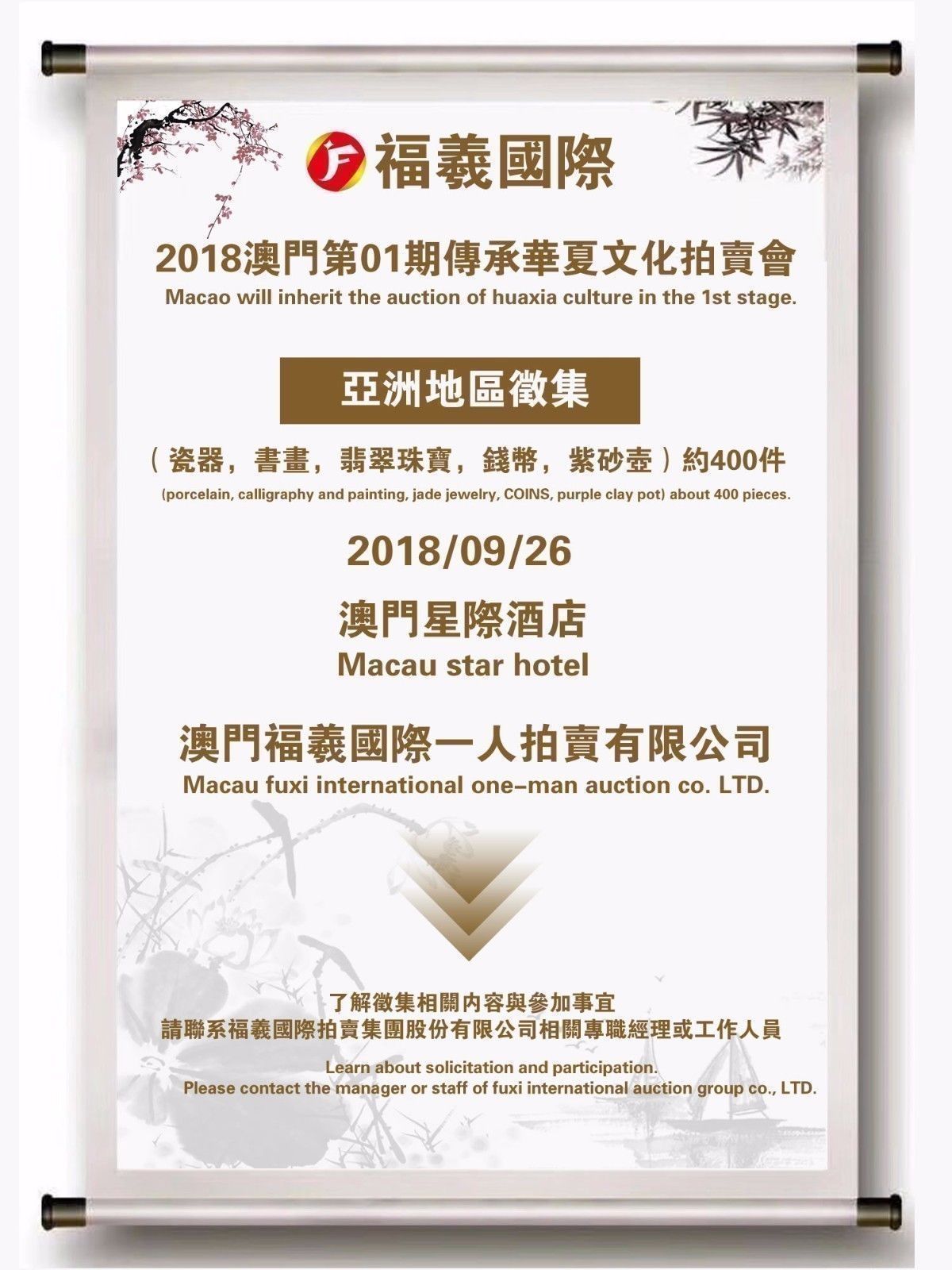 2018澳门福羲国际第01期传承华夏文化拍卖会预告:
