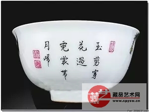 侧面海有乾隆御笔行楷题诗:“玉剪穿花过,霓裳带月归”,碗底有蓝楷书款《乾隆年制》。在2006年11月28日香港佳士得“中国瓷器及工艺品”秋季拍卖会上,被香港女富豪、收藏家张永珍以1.5123亿港元(约为1.3亿元人民币)拍得。