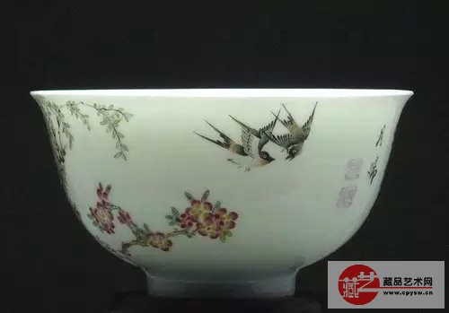 跟宋朝清冷的韵味比起来,清乾隆帝的风格就鲜艳热闹了很多,连名字也长多了。这只碗名叫清乾隆御制珐琅***林春燕图碗,是乾隆珐琅彩瓷器的杰作。碗上绘有杏花盛开,春风吹绿柳,双燕比翼飞。