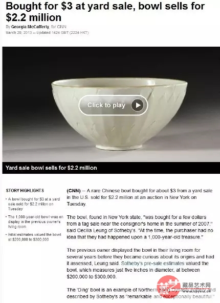 收藏圈流传着这样一个故事:10年前,美国纽约有一家人在旧货甩卖中花了3美元淘到一只乳白色的旧瓷碗,买完之后就放在家里的壁炉上当做装饰品,直到有一天一位专家去家里做客,看到这个碗之后直接就震惊了。