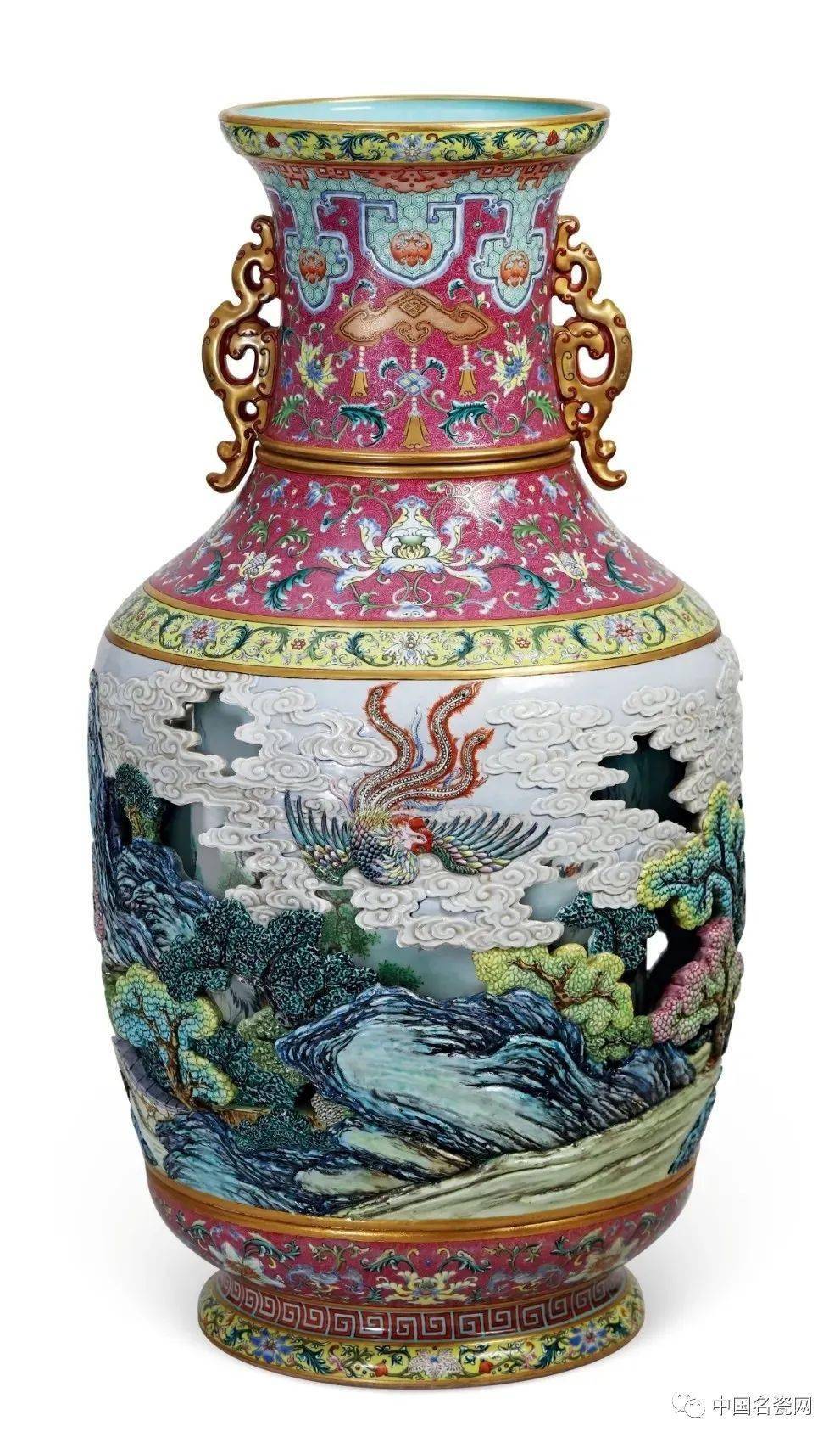 本次北京保利春拍亮相的「有凤来仪百鸟朝凤」图转心瓶,集合洋黄、果绿、矾红、金彩、松石绿釉、胭脂红料彩、蓝料彩于一身,集轧道、雕瓷、镂空、转心等多种工艺,画面繁复而不杂乱,处处透露皇室威仪,巧夺天工,美艳华贵。