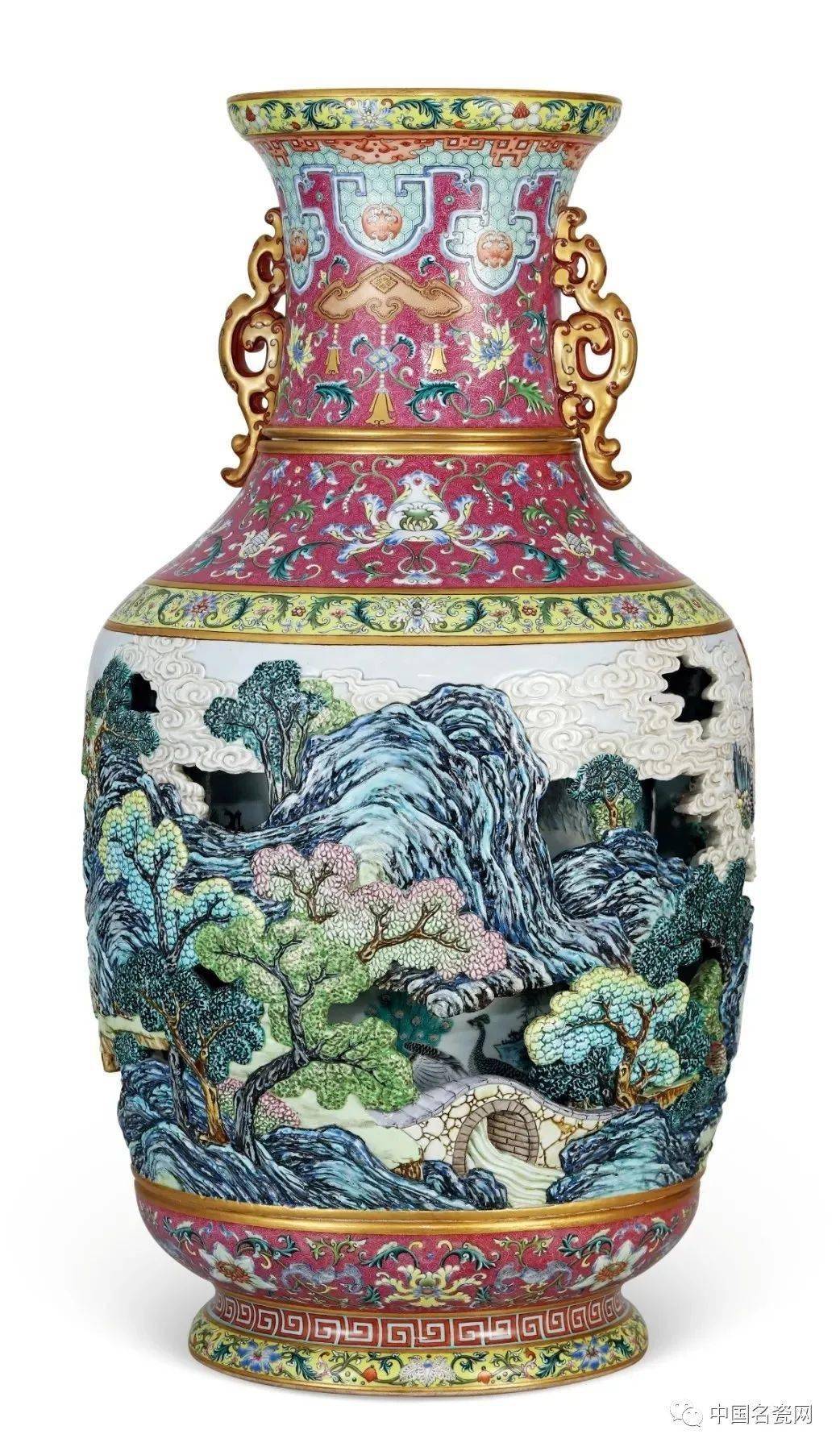 那么什么是转心瓶呢?转心瓶是中国陶瓷艺术的珍品,属于清代创制的一种瓶式,更是乾隆一朝极尽繁华之下的产物。其在一个镂孔瓶内,套装一个可以转动的内瓶,上绘各种纹样,有四季景物、山水人物、花鸟虫鱼等。动内瓶时,通过外瓶的镂孔,可以看见不同的画面,犹如走马灯。其工艺之繁复、所耗之工本,可谓冠绝当时,是盛清制瓷的巅峰,连乾隆也珍而重之。如此重器,多是博物馆的镇馆之宝。