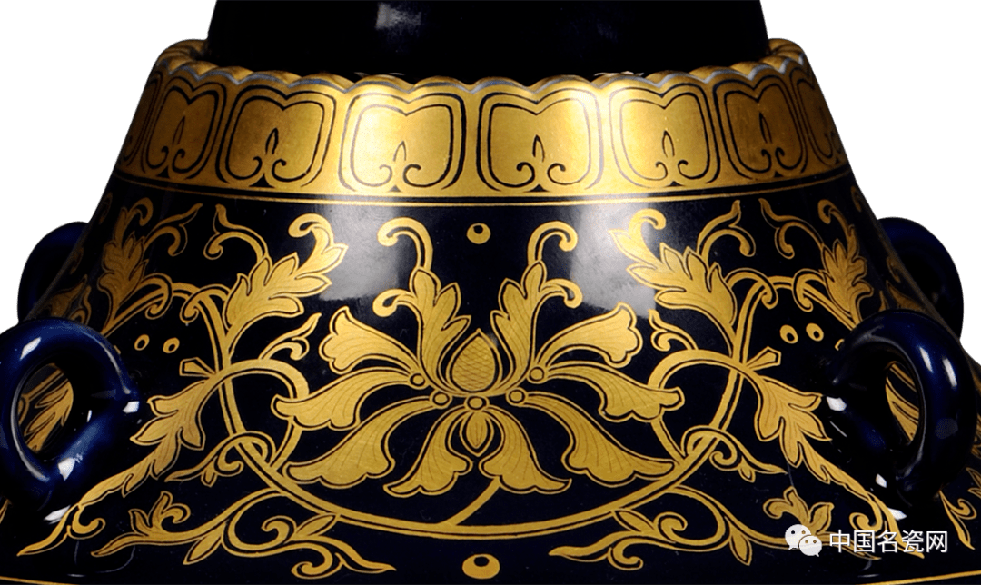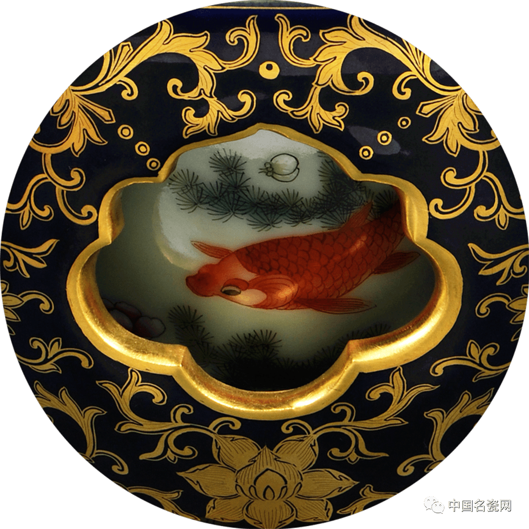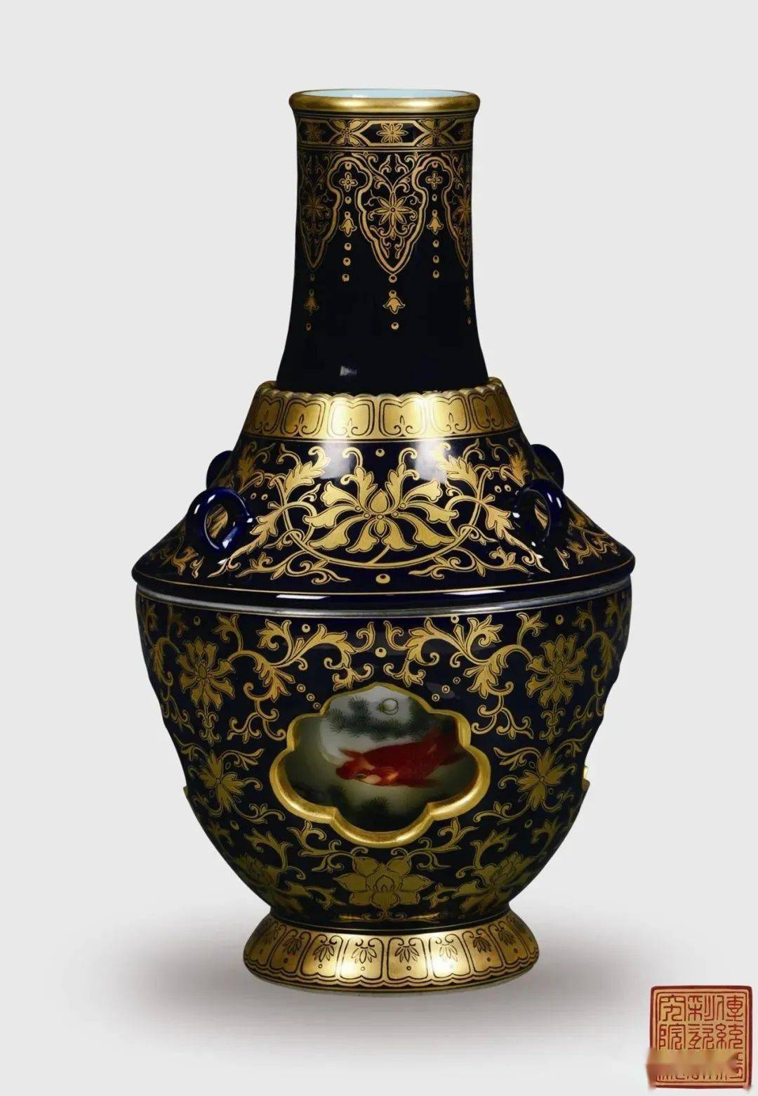 “当代粉彩官窑”景德镇市传统粉彩瓷研究院复烧的官窑重器中就不乏转心瓶精品之作,其不仅传承了传统制瓷工艺,更是创新性的在颜色、施釉、温度等的把控上有了工艺的提高和技术的突破。如这件霁青地描金鱼游春水瓶。